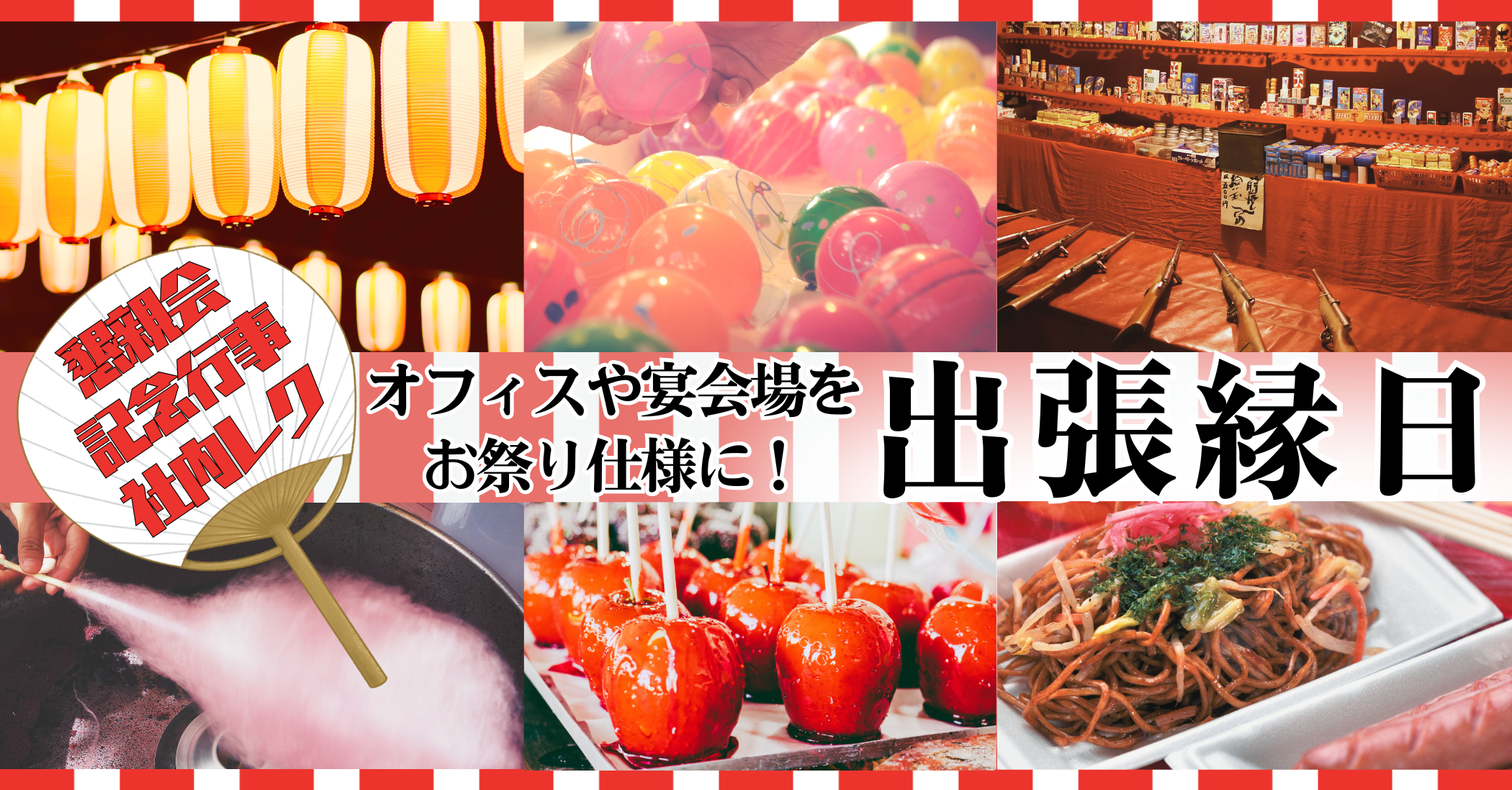 世代問わず気軽に楽しめて、社内イベント・ファミリーイベントにもお薦めの「出張縁日」。社員同士の交流を深めるのにも絶好のレクリエーションです。射的、輪投げなどの縁日ゲームをチーム戦にアレンジしたいり、縁日フード+季節食材を取り入れたビュッフェなどで満足度の高いお食事をご用意したりなど、ご要望に合わせて様々なご提案をしております。